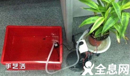 7、在植物附近放一桶水,把水管的一端连接潜水泵,另一端“喷”向植物。需要注意的是,潜水泵必须在水里面使用,在空气中使用会损坏。