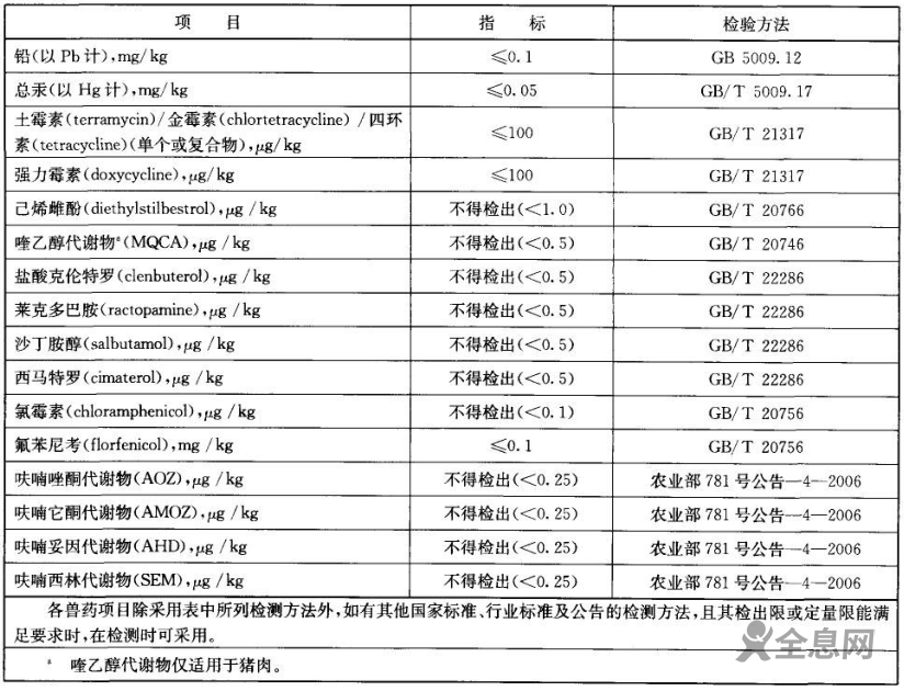 污染物限量、兽药残留限量、食品添加剂限量方面,调制肉制品要求最为严格,标准规定应符合GB2762、中华人民共和国农业部公告第235号等食品安全国家标准及相关规定以及下图的相关指标;而腌腊肉制品、酱卤肉制品、熏烧焙烤肉制品、肉干制品和肉类罐头制品只对铅、总汞、锡和亚硝酸盐做了限定。