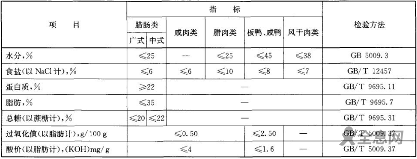 理化指标方面,不同类型的肉制品的要求有所不同。调制肉制品主要对挥发性盐基氮做了要求;腌腊肉制品则涉及水分、食盐、蛋白质、脂肪、总糖、过氧化值、酸价(如下图);肉干制品针对水分、蛋白质、脂肪、总糖、淀粉和食盐含量做了规定;而肉类罐头制品仅对食盐含量有所限制。
