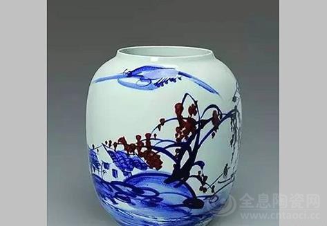 赖德全大师此类作品多采用国画的表现手法,其青花有深有浅有光感,极具水墨画韵味,釉里红点垛晕染,鲜红欲滴。他用釉里红画的花头是先打上一层薄的釉底,再在上面画。由于釉比较软,在烧制的过程中自然流动产生晕开的效果,经过窑火的艺术,自然形成了雍容典雅的形象,使人感觉浑厚富态,饱满而又大气,与器形的结合也相得益彰。他在继承传统之时,利用单色釉状物抒情,畅吟独特的色彩语言和艺术诗韵,令人叹为观止。