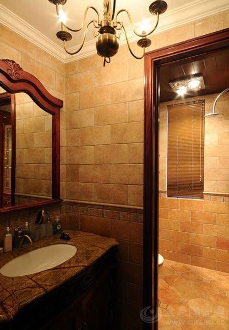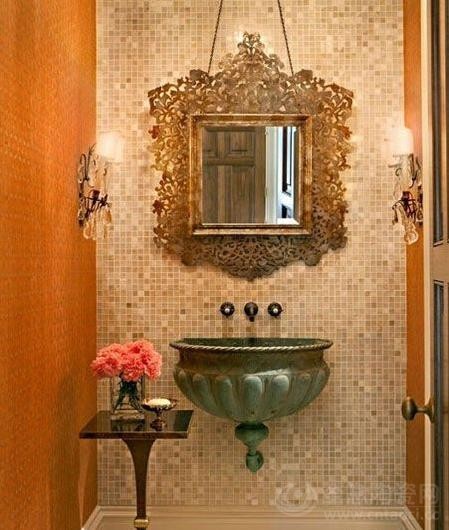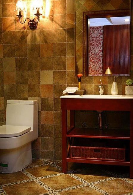 装修tips:复古色调的彩色瓷砖与大理石地面拼贴出这一具有复古感觉的卫浴空间,特别是墙面上的壁灯为这个卫生间添加了不少复古氛围,简约的整理台也显出一种异域气质。