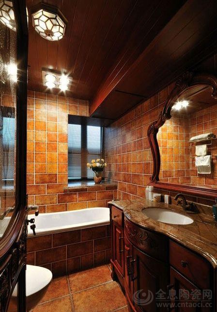 装修tips:美式古典风格是众多家居装修装饰风格中的一种。美式古典风格的家具和家居用品在材质及色调上都表现出粗犷、未经加工、或二次做旧的质感和年代感。用具多以舒适实用和多功能为主,不过分强调繁复的雕刻和细节,营造返璞归真的境界。这个卫生间的复古色彩就更加浓郁了:浅色马赛克墙面与明朗的橘色墙面组合,加以繁复镂空花纹边框的镜面,在两旁加以对称的暖色小壁灯,让这一空间显出一种华贵范。青铜色的台盆可谓是整个房间最吸睛的装饰,复古韵味十足。
