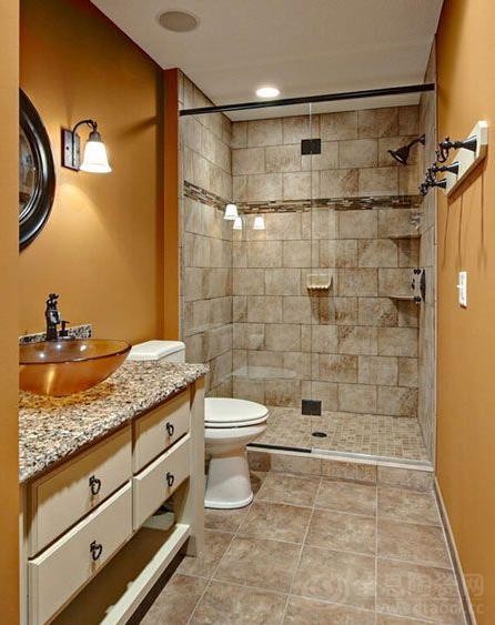 装修tips:以橘黄色墙面为主色调的卫浴空间里,淋浴区则以大块面灰色砖墙造型呈现,与整个浴室地砖融为一体,塑造出了这一空间整个墙面的层次感,简约的玻璃移门来作为空间隔断,实用且美观。墙面上的壁灯使这一空间中有股淡淡的复古感觉。