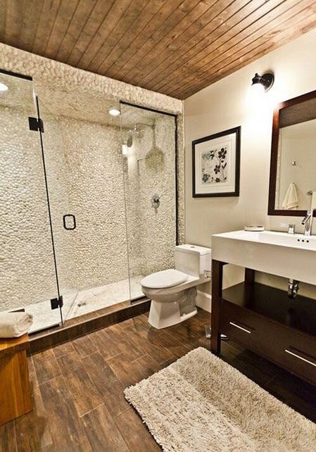 装修tips:木质地板与木质天花板都让这间卫生间透出一种自然舒适的气息,以白色粗糙墙面打造出的玻璃淋浴房在这间卫生间中也显得大气,在白色墙面上嵌上一幅优雅的黑白画幅让整个卫生间都拥有了一种雅致感。洗漱台前随意搭配一块灰白色的地毯防滑垫,既温暖也不失为卫生间的一件装饰品。