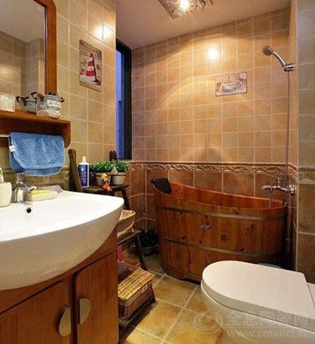 装修tips:这个卫浴间,以古朴的木质浴桶来替代浴缸,小小的卫浴空间中就此显出一种古朴的感觉,浅色正方瓷砖在暖色灯光照射下,让整间卫生间的温馨舒适感倍增。盥洗台旁边的收纳架,既起着收纳的作用,也不失为卫浴间的一个个性装饰。