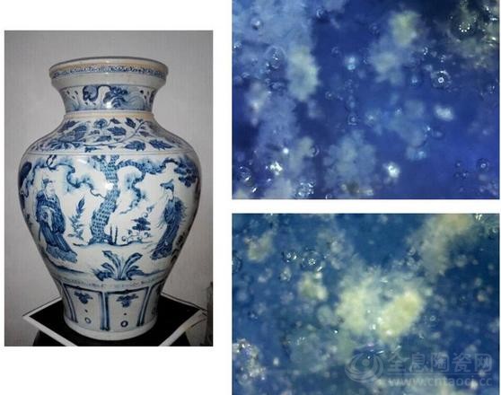 在青白釉厚的瓷品中其青花上的白色气泡特别多,当青白釉薄时便见到青花上有不少被气泡冲破的麻面小坑(最好放大200倍以上观测),这也是它的特征。