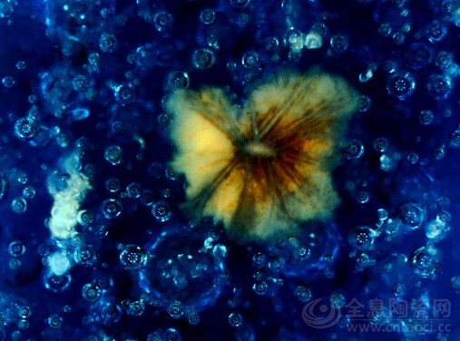 1.是窑烧中气泡破裂;表面中间留有针眼的死气泡。