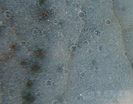 图8这件北宋钧窑执壶的气泡,就处在完全死亡的坑洞期。由于年代久远,死亡气泡已经演变为一个个裸眼就能看到的圆形坑洞,坑洞中还积满黑褐色尘埃和生活垃圾。