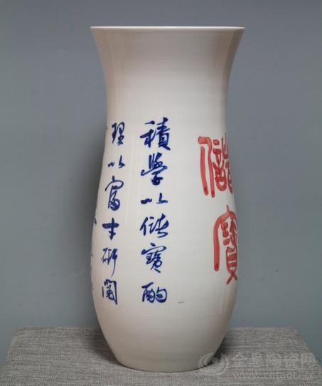 杨剑篆、行草书景德镇美人尖《积学储宝》(釉下青花彩,高43.8cm,直径18cm,口径19.8cm,150件,2013.9.21.创作,江西上饶卢秀梅藏)