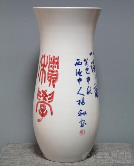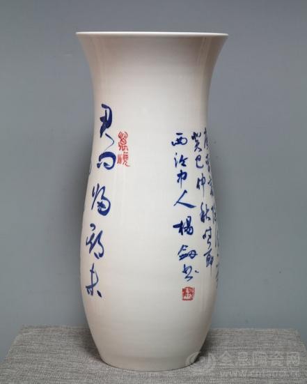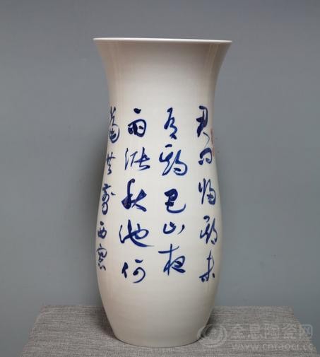 杨剑草书景德镇美人尖《唐李商隐诗》(釉下青花彩,高43.8cm,直径18cm,口径19.8cm,150件,2013.9.21.创作,江西上饶卢秀梅藏)