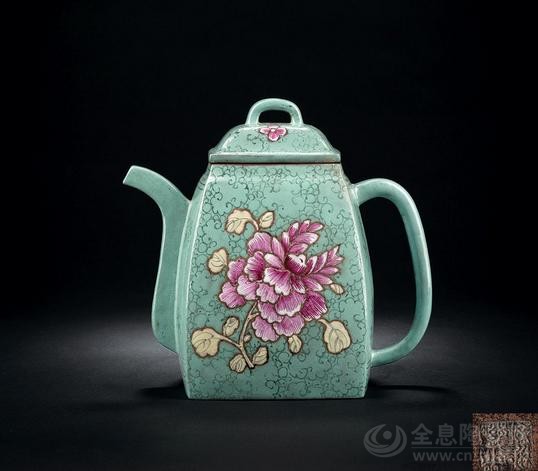 紫砂粉彩汉方壶,为宜兴紫砂所制,胎细质坚。