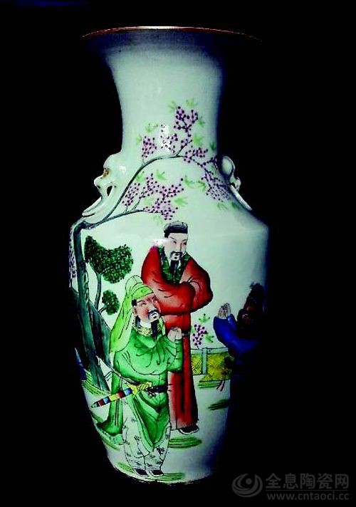 桃园三结义。“这一拜,春风得意遇知音,桃花也含笑映祭台。”桃园三结义出自《三国演义》的第一回“宴桃园豪杰三结义 斩黄巾英雄首立功”。述说刘备、关羽和张飞三位仁人志士,对天盟誓,举酒结义。这只兽耳瓶高42厘米,直径19.5厘米,上面绘制的正是“桃园三结义”图案。只见在绿色的叶子,粉红的桃花树下,身穿红袍的大哥刘备站在上位,双手抱拳作揖;身穿绿袍的二弟关羽跪在左边,双手作揖,腰间的花色宝剑,熠熠发光,引人注意;身穿蓝袍,满脸络腮胡子的三弟张飞,跪在右边,双手作揖。