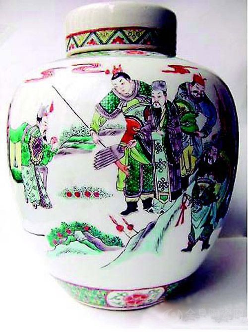智收姜维。“到如今我年迈名将凋丧, 是何人继承我大任担当?”智收姜维出自《三国演义》的第九十三回 “姜伯约归降孔明 武乡侯骂死王朝”讲述诸葛亮为谋统一,北伐中原。天水一战,老将赵云败于姜维之手,赵云盛赞姜维,诸葛亮观察姜维阵法,深为敬佩,遂以计相困,并晓之以理,感姜维归顺。这个清末五彩盖罐,高29厘米,口径11.3厘米,底16.1厘米。腹部绘“智收姜维”图,诸葛亮手摇羽扇,在赵云、关平、张苞的护送下,来到姜维面前。而姜维双手抱拳,单膝跪地,口服心服愿意归顺蜀国。