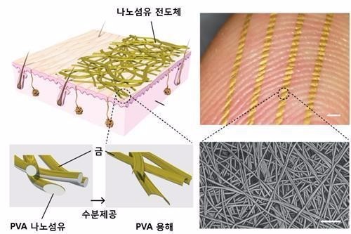 “呼吸电子皮肤”利用在易溶于水的高分子材料聚乙烯醇,在其表面镀黄金颗粒,并利用直径300-700mm的纤维编织成网。它具有较好的伸缩性,可直接用水粘在在手指或关节处,无需粘着剂,并能反复使用。