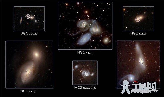 剧烈的星系合并能够“喂饱”超大质量黑洞,其后果就是在超大质量黑洞附近的区域产生强烈的高能辐射,并产生宇宙中某些最明亮的天体。天文学家将这些天体命名为活动星系核,简称为AGN。在过去的数十年中,只发现大约百分之一的AGN似乎和星系合并事件有关。然而,来自NASA雨燕卫星巡天计划的硬X射线波段探测结果却表明AGN和合并星系之间存在很强的关联。硬X射线能够更有效地穿透合并星系内的尘埃和气体云,揭示来自活跃黑洞的辐射。上面这些影像标示出雨燕卫星探测到的各种合并星系内超大质量黑洞的位置(圆圈)。光学影像来自亚利桑那州基特峰国家天文台。顶部中央是NGC 7319以及斯蒂芬五重奏星系团。(编译/虞南华)