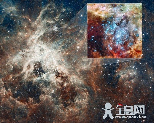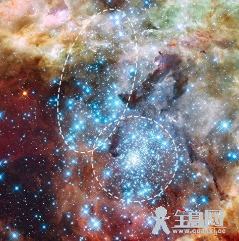 报道称,这两个星团在大麦哲伦星云中,距离地球大约17万光年,正处于合并的早期阶段。起初,科学家以为这是一个大星团,但哈勃望远镜数据显示,这两个星团的年龄相差100万年。