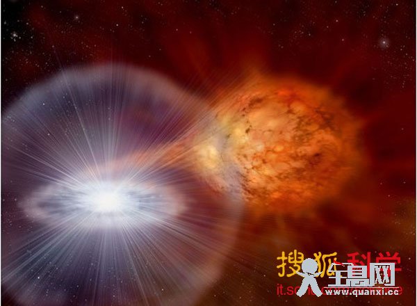 当红巨星随着时间的推移而膨胀的时候,其外层的物质就会流入到白矮星伴星的表面,当白矮星不能承受自身重量的时候,就会发生更剧烈的爆炸——“超新星爆炸”