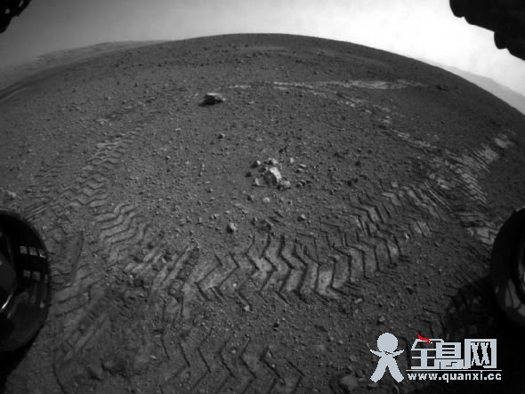 这是好奇号的前部避险相机的鱼眼镜头拍摄的好奇号在火星表面留下的第一段轮胎印迹