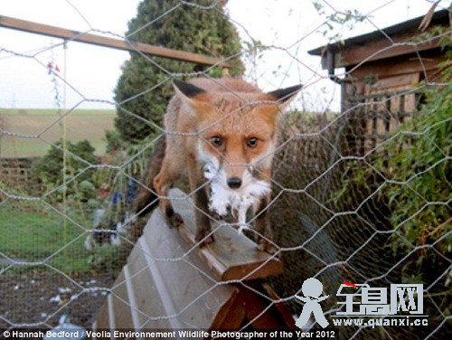 今年11岁的英国女孩汉娜(Hannah Bedford)家中饲养了4只母鸡。一天早晨,她准备上学时,突然发现家中的鸡舍上站着一只动物。她起初以为是只狗,但细看,竟然是一只满嘴鸡毛的狐狸。汉娜立刻抓起相机,拍下了这只偷鸡的狐狸。