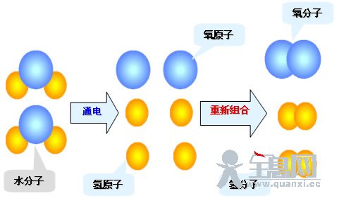 表示水分子的模型,取其中的两个水分子表示其电解的过程。