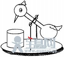 只见小鸟缓缓进入低头过程,振荡几下以后,低头到把嘴喙插入小杯的水中,然后抬起头来。不一会,它又低下头去,重复上述过程,往复不断地运动。