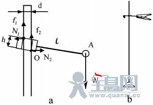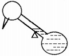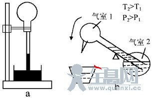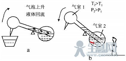 我们对这一实验非常感兴趣,在定性实验前,我们学习了有关的准备知识,为使我们能够看到一些现象,教师把饮水鸟颈部的漆刮掉了部分,并告诉我们饮水鸟内部装有乙醚这种液体。我们一次又一次地观察,并相互讨论,观察得非常仔细。开始,我们猜想可能与小鸟低头“饮水”有关,是否是杯中的水吸到头上使重心前移?但为什么会抬头呢?抬头后没有饮水,为什么又低下头来呢?我们不能解释。后来,我们又发现管中有液柱上升的现象,因此假设由于液柱上升而使重心前移,于是提出图2的模型,但为什么液柱会上升呢?还是不能解释。我们又仔细的观察,发现小鸟的头部有一层湿润的材料覆盖(吸湿性好的纱布),它与液柱上升有什么联系呢?当我们积极思考而难以进展的时候,有的同学想到了一种伽里略气体温度计的模型,如图3(a)所示,当上方烧瓶外表的水份蒸发时,玻璃管中的液柱就会上升。由这个模型使我们得到启发,经过讨论,找到如图3(b)的模型。尾泡中有乙醚的液体,将头泡和尾泡隔开形成两个气室。乙醚具有易挥发的特点,头泡和尾泡的气室中充满乙醚的饱和汽:于是我们想到了液柱上升的原因可能是尾泡与头泡间的温度差。而温度差的形成又是由于头泡表面吸湿后水的蒸发造成的。这样就得到如下的逻辑:温度差——压强差——液柱上升——重心升高——倾倒。而饮水鸟低头后为什么会抬起头来?偶然间,我们发现小鸟每低一次头在颈部玻璃管外都有一个气泡产生,气泡是从尾泡中来的,当我们用手握住尾泡时,发现液柱上升更快,气泡更容易产生,这些现象启发了我们,提出“当小鸟倾倒到一定程度时,尾泡中玻璃管口离开液面,气泡沿管上升,头泡中的气体压强变大,液体倒流回尾泡,从而使饮水鸟又抬起头来(图4(a))”的假设。它能够较满意地解释表观的现象。