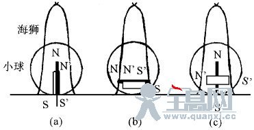 对于第一个问题,学生很容易猜测到小球和海狮内部都有磁铁,并且有同极性的位置关系(例如,如图2所示),但为什么小球绕竖轴旋转却无法解释。