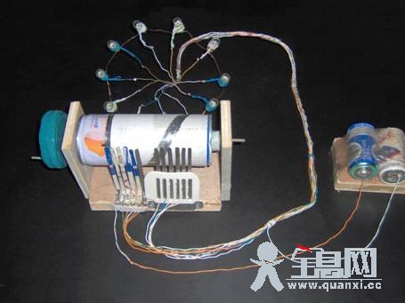 开始,大家把很多从多芯电线上拆下来的电线剪成一段一段的电刷子,然后焊在易拉罐表面上,而把来自各个电珠的电线插放在不同位置上。当摇动易拉罐时,这把转动的电刷子就会先后接触各根电线了。可是,这样太难焊啦,电线位置也不好固定。后来,有的小朋友看到书上画写的可以转动的开关,它们装在电动机轴上,叫做“换向器”,就大叫:“换向器!……换向器!”“啊!太好啦!”“把电刷子插在旁边!”“那易拉罐表面怎么办?”“像换向器一样,一条一条的。”……一下闷啦!都在思考呐.“这……一条一条的……怎么搞?”“……哦!用纸贴上!不贴的地方就会通电,灯就亮!”“……那……那不就要亮都亮,要熄就都熄啦?”“怕什么!把纸条贴成弯的嘛!”“对!对!这样,有的先碰上先亮”“后碰上的后亮!”“还可以弯来弯去的,不就亮来亮去的啦!”不少声音都是抢着说的!“哈哈哈哈!”一片笑声中大家动手干开了!