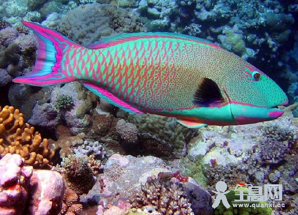 体侧扁。幼鱼体色为前橘後白;初始型的雌鱼(IP期)为棕红色,体侧鳞片具2~3条暗色短纹;终期型雄鱼(TP期)为蓝绿色,鳞片具橘红斑或镶边条纹,尾鳍月形。