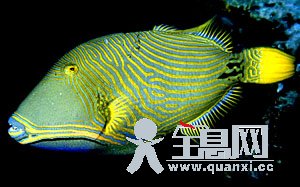 一黄色横纹,口的上下都有黄色横纹,口的上下都有条纹伸向胸鳍下方,上下颌齿为具缺刻之楔形齿,眼中大。尾鳍钩状棘处有一大