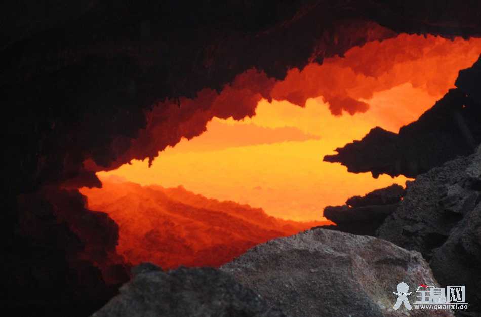2012年10月17日,在夏威夷基拉韦厄火山一处活跃的火山锥东北一侧,岩浆顺着裂缝流出,直至地表径流发达的沿海平原地区。人们将熔岩管顶部的洞口称为“天窗”,从那里便可以看到火山内部炙热的熔岩流。