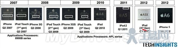 苹果首款定制的A系列处理器A4于2010年在第一代iPad中使用,当年后期用于iPhone 4, 2011年iPad 2采用了A5处理器,后来该处理器也用于iPhone 4S。自那时起,iPad新机型开始使用增强型芯片,并在芯片的名称后加上“X”,如第三代iPad采用A5X芯片,第四代iPad采用A6X,去年的iPhone 5搭载的是A6处理器。