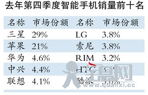 昨日,市场研究机构IDC的数据显示,去年第四季度全球智能机出货量除三星、苹果继续以29%、21%的份额占据较大份额外,中国手机品牌占据了全球市场TOP10榜单的一半,“中华酷联”四家份额超过16%,加上中国台湾的HTC,中国有五大品牌进入全球前十位的名单,其中酷派以3%的市场份额首次跻身于全球TOP10。