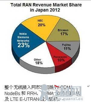 据悉,2012年,在日本市场三大运营商软银、KDDI和NTT DOCOMO 对 LTE 的强大需求推动下,日本移动基础设施(2G/3G/4G)市场蓬勃发展,而这三大运营商都是诺西的客户。Infonetics Research 在四月的一份报告显示,“诺西在日本无线市场以 23% 的份额位居第一。”