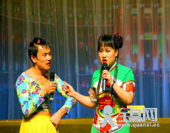 二人转的表演手段大致可分为三种。一种是二人化装成一丑一旦的对唱形式,边说边唱,边唱边舞,这是名副其实的“二人转”;一种是一人且唱且舞,称为单出头;一种是演员以各种角色出现在舞台上唱戏,这种形式称“拉场戏”。