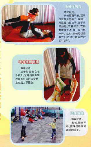 家长仰面平躺,双手扶住孩子的腋下,双腿上抬屈膝托住孩子,孩子头部抬起,双臂张开,双腿并拢伸直,好像一架飞机一样。这时,家长可以带着“飞机”进行前后左右的“飞行”。