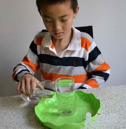 材料:纽扣1枚、水少许、浅底盘1个、玻璃杯1个