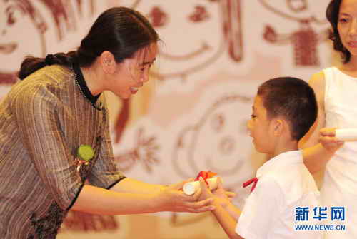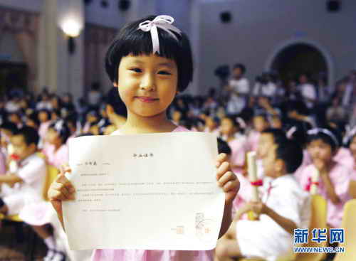7月17日,沈阳皇姑区实验幼儿园园长为小毕业生颁发毕业证书。新华社发(姜冰 摄)