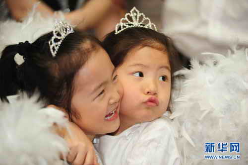 7月17日,沈阳皇姑区实验幼儿园两位小毕业生在毕业典礼上亲密拥抱。新华社发(姜冰 摄) |