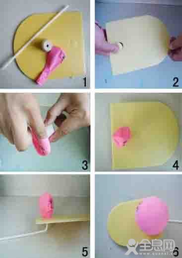 3、在橡皮塞的另一端套入气球,并将两个三角形状的KT板粘到大的KT板上面,(可粘在KT板的两侧也可随意发挥宝宝的想像力,让其自由选择粘贴位置)。