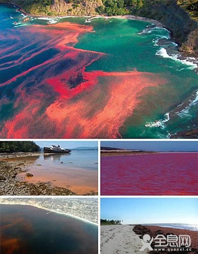 当水藻类生物在河口,入海口突发性的迅速繁殖积累,以致使得整个地区的海洋或沙滩变成血红色的现象,称之为赤潮,有时也叫红潮,这是个历史概念的定义,不是所有赤潮发生时水面都呈现红色,根据引发赤潮的生物的数量、种类不同,有时也出现黄、绿和褐色等。