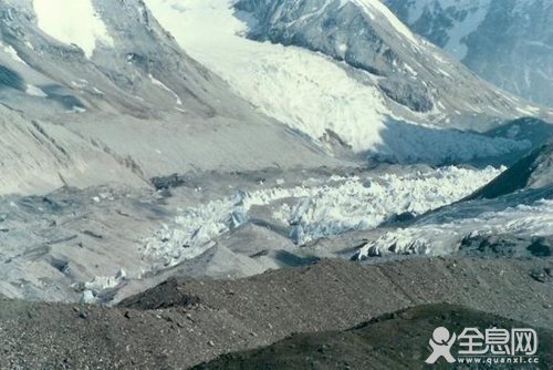 (5)中碛:两条冰川汇合后,其相邻的侧碛即合而为一,位于会合后冰川的中间称为中碛。