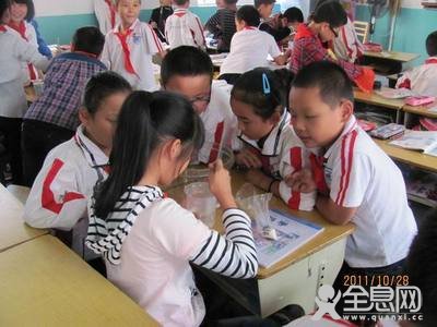 6.学生汇报:高锰酸钾在进入水的前中后有什么样的变化?它在水中溶解了吗?它与食盐在水中的溶解有什么异同?