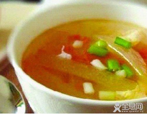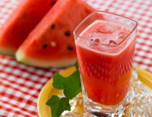 冷饮西瓜汁:将西瓜瓤500克,去籽,放入榨汁机中打成汁状,加入500毫升凉开水及适量白糖和少许盐,在冰箱中略冷却后饮用。本品具有清热消暑、生津止渴的作用。