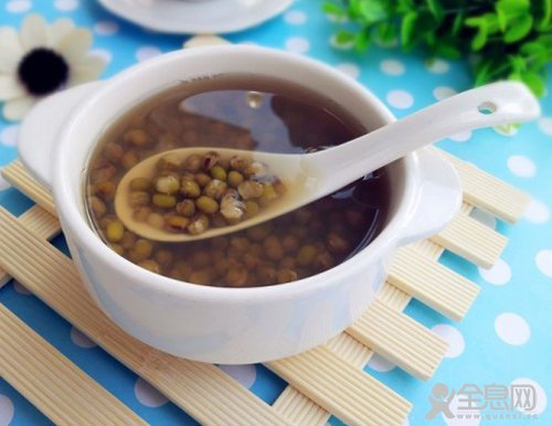 绿豆汤:绿豆100克,大米20克(加入少量大米,能够去除绿豆的苦涩味),水3000毫升。将绿豆、大米及水放入高压锅中煮沸20分钟,待凉后饮用。本品有消暑热、止烦渴的作用。(用绿豆100克,大米200克,煮为绿豆粥,有健脾消暑止渴的作用。