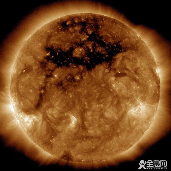 这幅图片是NASA太阳动力学天文台于10月15日拍摄到的。日冕洞的形成是因为太阳表面某处的磁场不再向太阳内部循环,而反之向外发射磁场,俗称太阳风。在强烈的紫外线波长照射下,日冕洞是一片黑暗的区域,如图中所呈现的一样。有时,在地球高纬度地区,太阳风会引发极光现象。