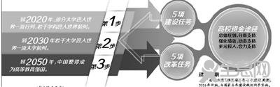 第一步到2020年,若干所大学和一批学科进入世界一流行列,若干学科进入世界一流学科前列;