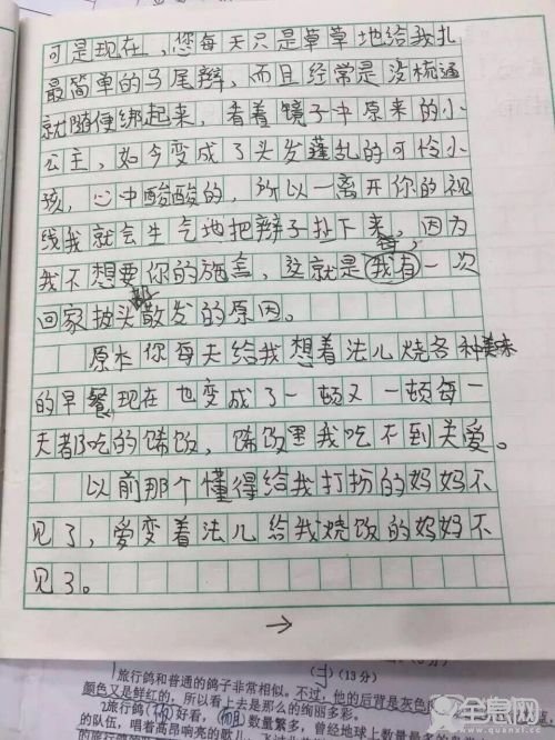 璐璐这篇700多字的作文,经温州某微博曝光后,引来诸多网友的热议:有人夸赞小女孩的文采;有人为她感到心酸;更多的,是希望小女孩能体谅妈妈的辛苦。