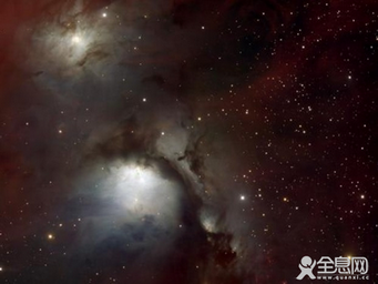 猎户(Orion)座中的星云状物质。图1是M78星云,图2是猎户座大星云。猎户座大星云直径约16光年,距离1500光年,质量为太阳质量的300倍左右。M78是一个位在猎户座的反射星云。它是夜空中最亮的反射星云之一。星云内的尘埃除了吸收光线之外,也反射了从数颗星云内新诞生的蓝色亮星所辐射的星光;让怪异的蓝色辉光和鬼魅般的黝黑尘埃云柱,成为这个星云最突出的特点。星云内的尘埃微粒会散射星光,更加深了星云的蓝色色泽。这种散射机制,和地球天空是蓝色的道理是很相似的。用小型的望远镜就能看到的M78,它的大小约是5光年。因为M78和我们之间的距离是1600光年,所以照片所看到的景像是M78在1600年前的状况。M78是猎户座分子云团的一部份,其它的成员还包括有猎户座大星云和马头星云等。