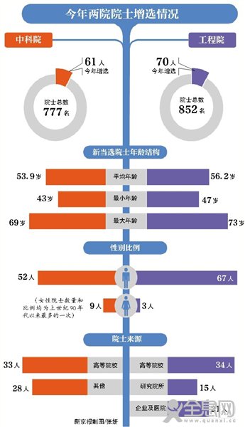 此次新增的两院院士中,年轻化趋势进一步显现。工程院新增院士中,最小年龄47岁,最大年龄73岁,平均年龄56.2岁,比2013年下降0.7岁。其中,60岁(含)以下的56人,占80%。中科院新当选院士中,最小年龄43岁,最大年龄69岁,平均年龄53.9岁。其中,60岁(含)以下的占88.5%。